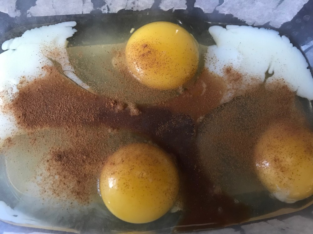 2. In an oval/ rectangular container, combine eggs, milk, vanilla and a sprinkle of cinnamon. When you add the cinnamon, make sure that you lightly sprinkle the cinnamon so that it doesn’t clump together. Using a small whisk or a fork, beat the mixture until combined.